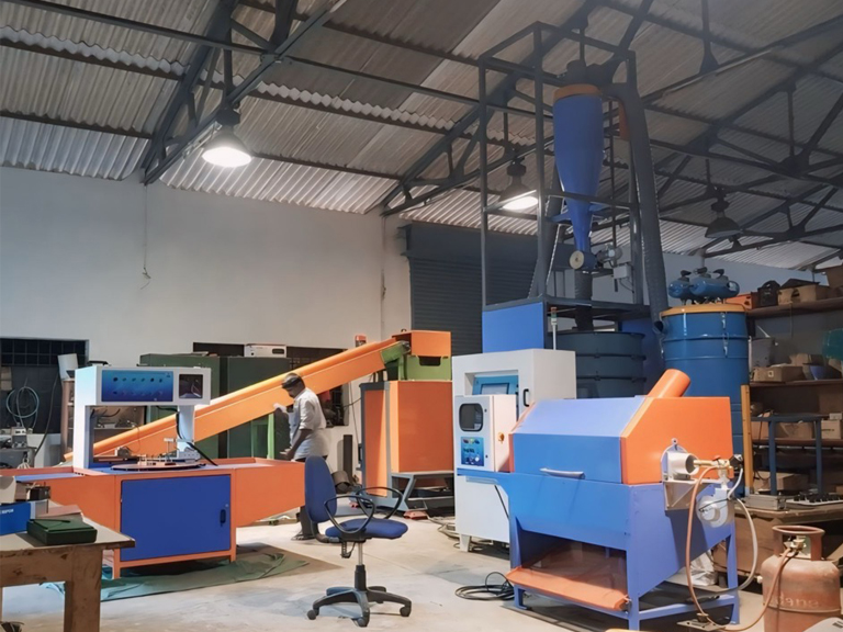 - The hammered material is further sucked by a cyclone material collector. This has a 5HP blower. Bag filter is also provided.